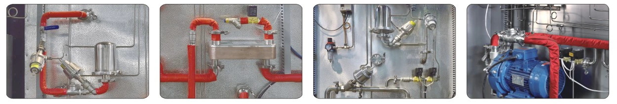 ● Сантехнічні труби з нержавіючої сталі 304 із затискачами. Застосування пневматичних клапанів GEMU з кутовими сідлами, імпортованих з Німеччини, електромагнітних клапанів, що постачаються Taiwan AirTAC, і безпосередньо підключеного водяного кільцевого вакуумного насоса, імпортованого з німецької SPECK.